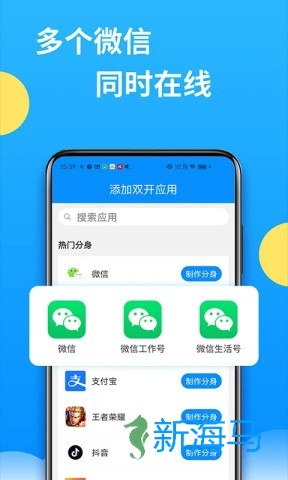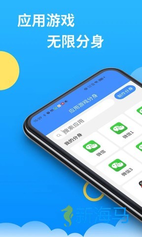 作为全球首款应用双开App,支持微信双开、QQ双开、淘宝双开、陌陌双开等多种应用的双开分身,让双账号同时在线更为便捷,趣味十足!