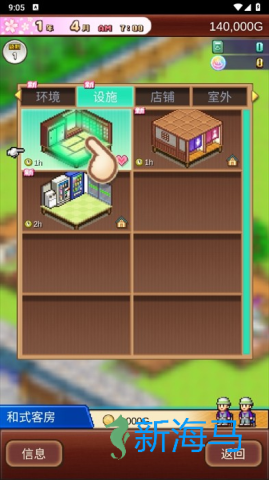1、首先打开游戏界面,点击“开始营业”,进入你的温泉店。跟随游戏的提示来选择房间并开始建造,完成各种任务以迎接顾客。