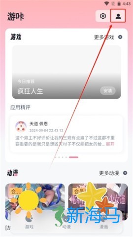 1、打开游咔后,点击右上角的头像,如下图所示;