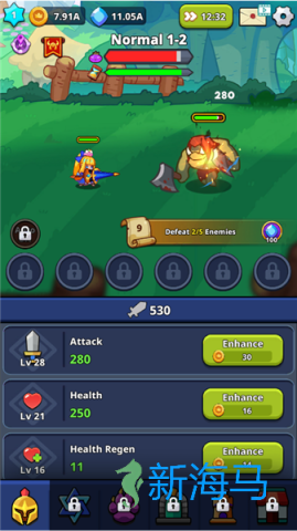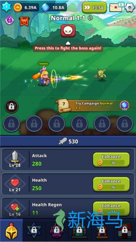 1、从本站下载游戏并安装,打开游戏后,它会自动进入挂机状态,你只需点击下方绿色按钮,用金币升级角色攻击力。