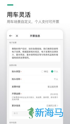 3、用车灵活,能够根据实际需求自定义用车场景,出行结束后进行统一结算,个人支付支持开票功能。