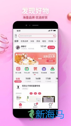 3、进入【发现好物】页,搜索自己感兴趣的品牌,关注【热门主播】和【每日优选】,参与直播选购。