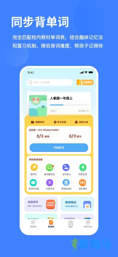 2、轻松背单词,记牢校内单词。这一部分完全匹配校内教材的词汇表,结合趣味记忆法和复习机制,大大降低了背单词的难度,帮你轻松应对课堂默写与考试。