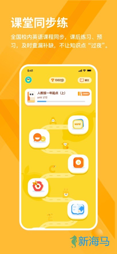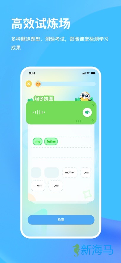 1、课程同步练习,紧跟校内进度。无论是哪个年级,与全国校内英语课程同步,每节课后都能进行单词拼写、跟读、完形填空和情景对话等针对性练习,确保知识点不“过夜”。