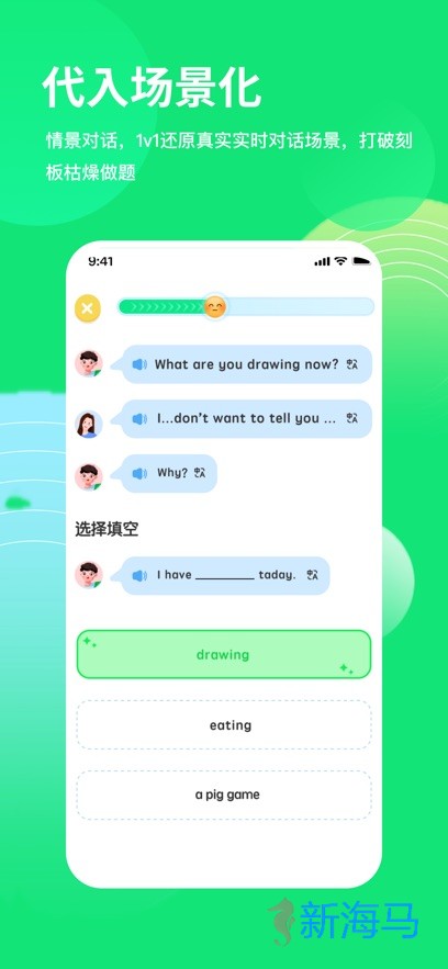3、情景课,沉浸式学英语。应用内打造了上百种真实的英语学习场景,无论是日常对话、校园交流还是购物出行,都能让你身临其境,练习表达,告别枯燥记忆,把学到的英语运用到真实的生活中。
