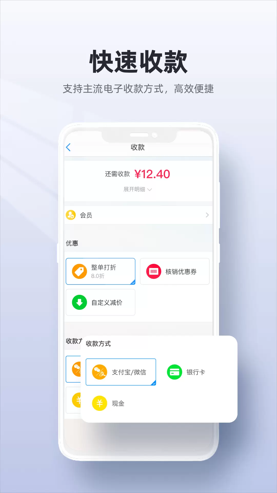 支持支付宝、微信、现金、刷卡等主流支付方式,免除你客户的等待,资金更是【即时到账】!完美解决复杂收款场景。