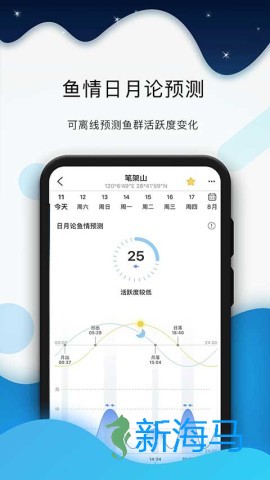2、应用提供海上任意位置的实时潮汐数据查询及分析功能,包含潮汐曲线、月龄、鱼类活跃度等多种实用功能。